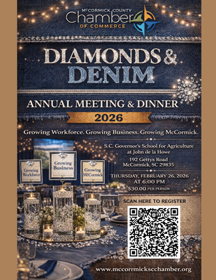 Join the McCormick County Chamber of Commerce for our 2026 Annual Meeting & Dinner - an evening of celebration, connection, and community impact at a NEW VENUE on the S.C. Governor’s School for Agriculture at John de la Howe campus.
